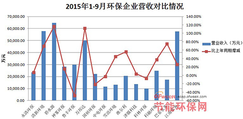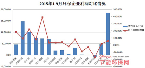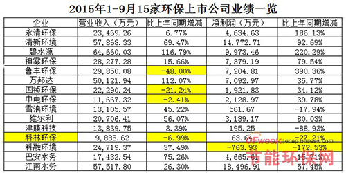 2015年1—9月15家环保上市公司业绩对比情况分析