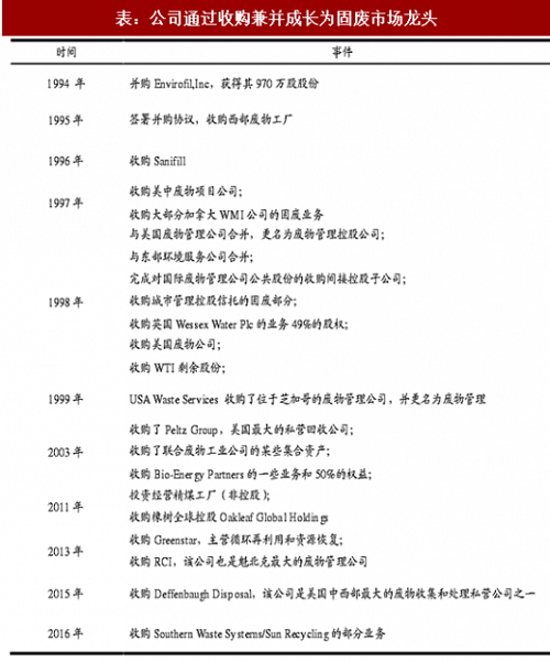其收购对象不乏一些固废行业大型公司,由于固废行业具有固定成本高,沿主业收购可显著提高其运营效率的特点,所以公司近十多年大量进行收购以扩大其业务范围。